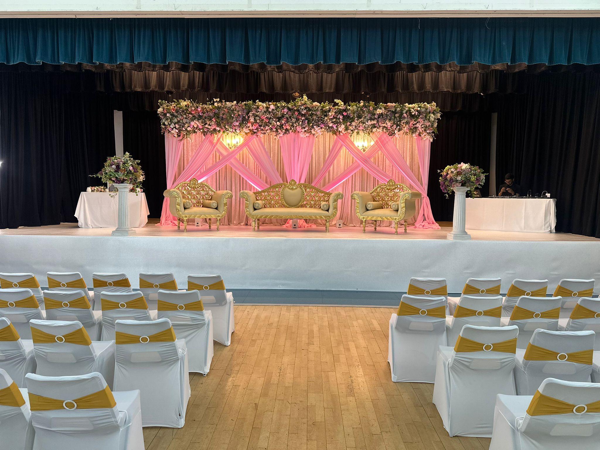 - Large stage with lighting and curtains