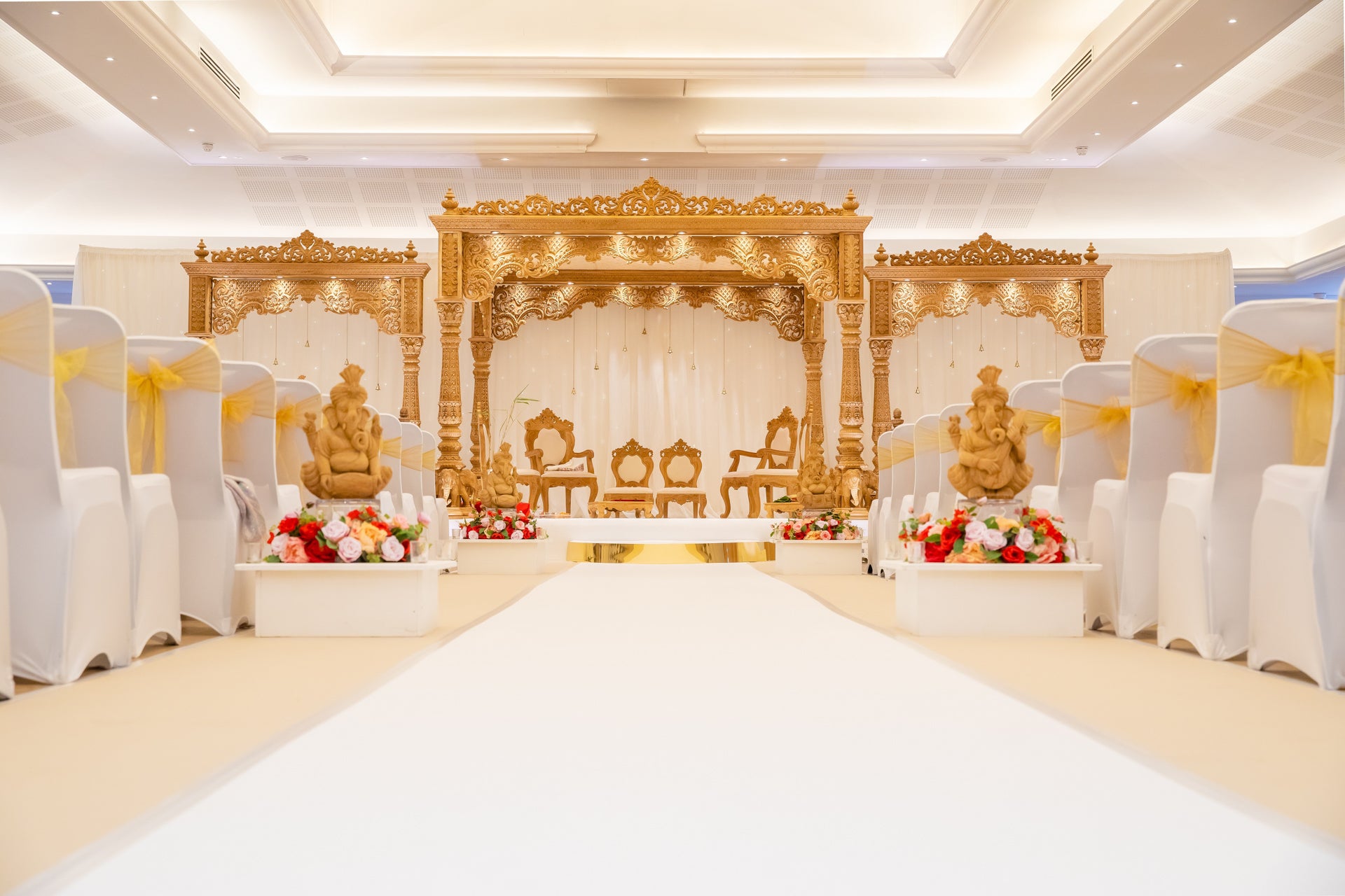 The Ganeshji Mandap package includes a choice of 4-pillar or 8-pillar mandap, with an optional gold roof fabric. A 30ft mandap backdrop with uplighting provides a beautifully balanced ceremony setting. The package also includes bride and groom seating, side chairs, Kanyadan chairs, Bajots, Patlas, and a Havankund for sacred rituals.