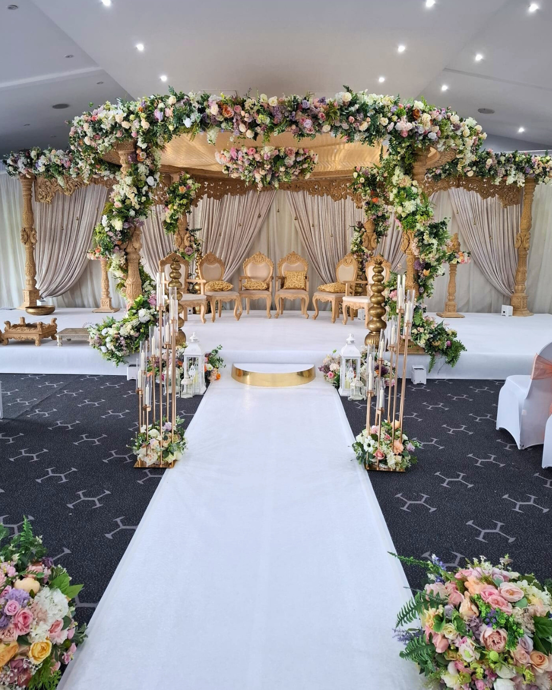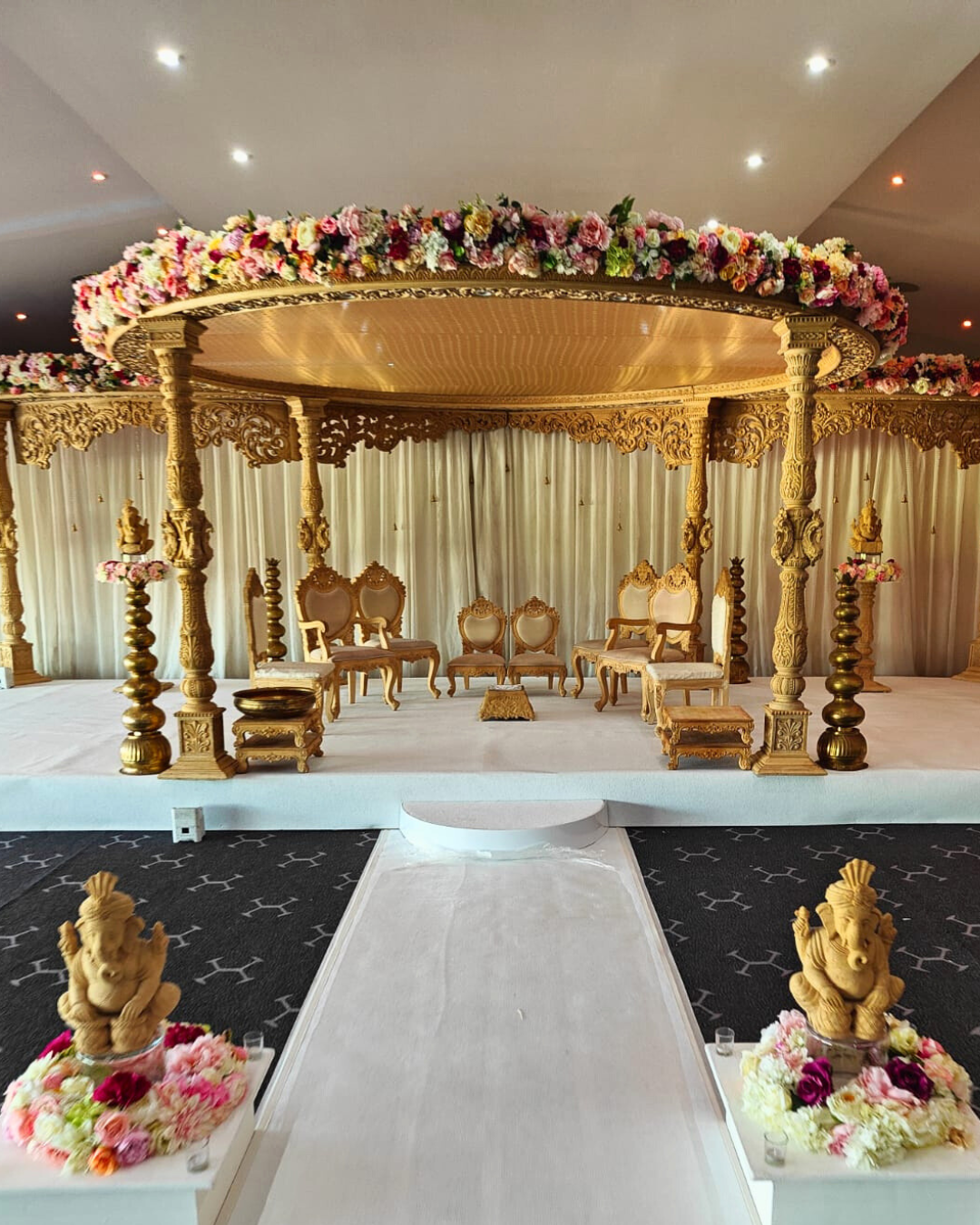 Introducing Mayura, a striking mandap handcrafted in-house by Avari Events. Designed as a statement piece, Mayura features intricately hand-carved peacock motifs on each pillar, symbolising beauty and elegance. These carvings can be removed if a cleaner, more minimal aesthetic is preferred.